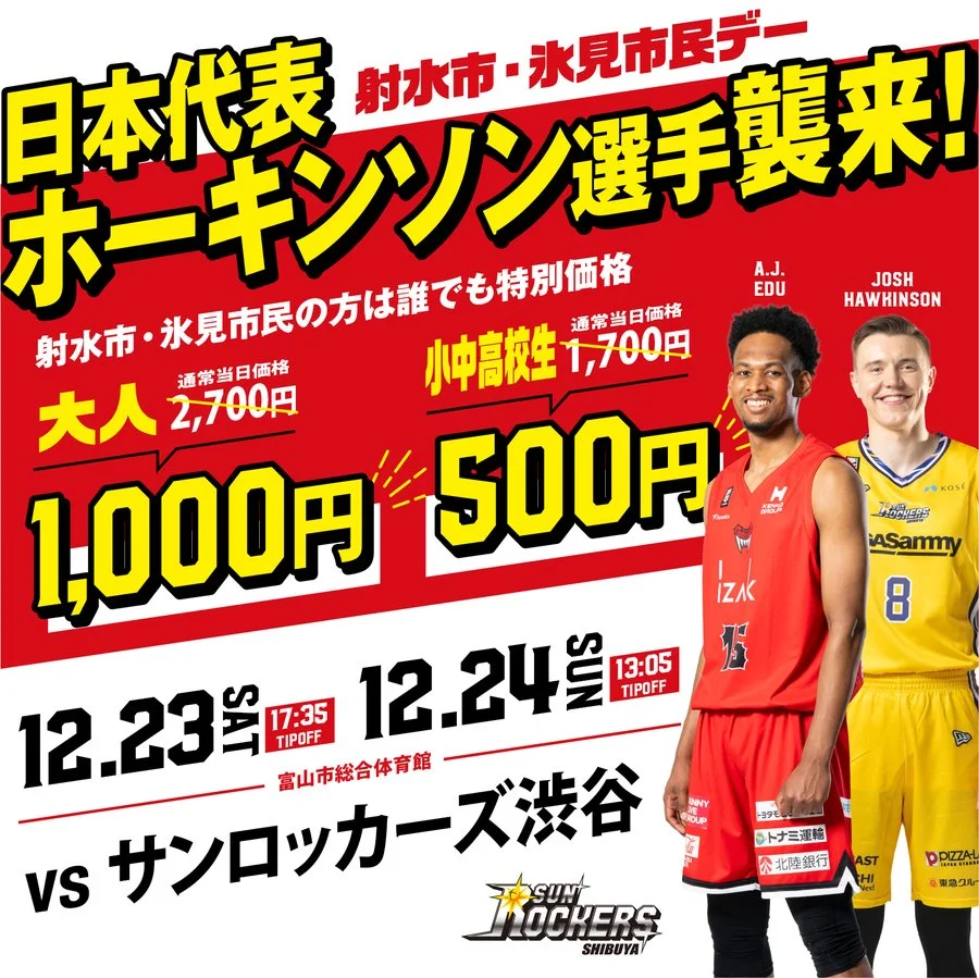 12月23日・24日両日は「射水市・氷見市民デー」で大人1,000円、小中高校生500円で観戦可能です。