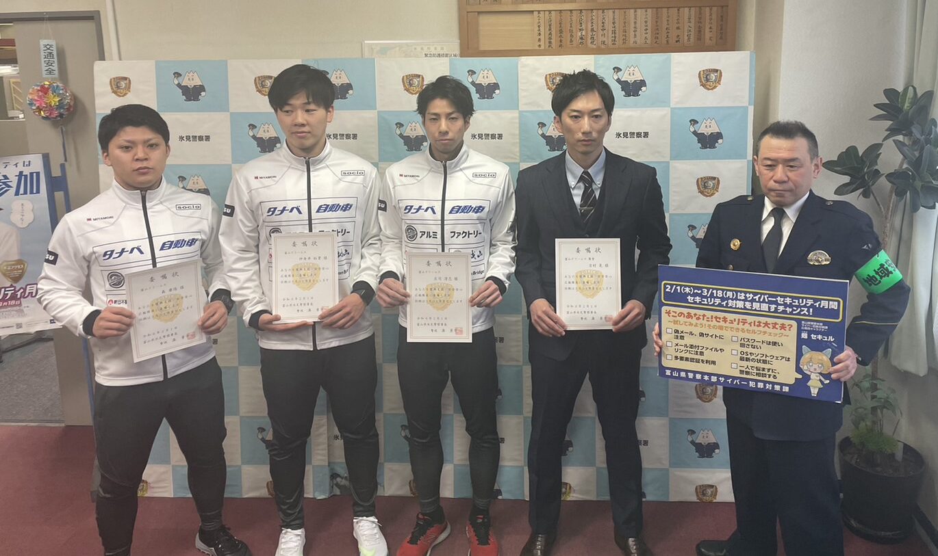 氷見警察署で2月1日〜3月31日まで「復興支援・安全安心広報隊」を結成されるにあたり、吉村晃監督は「広報隊長」、選手は「広報隊員」を受嘱しました!