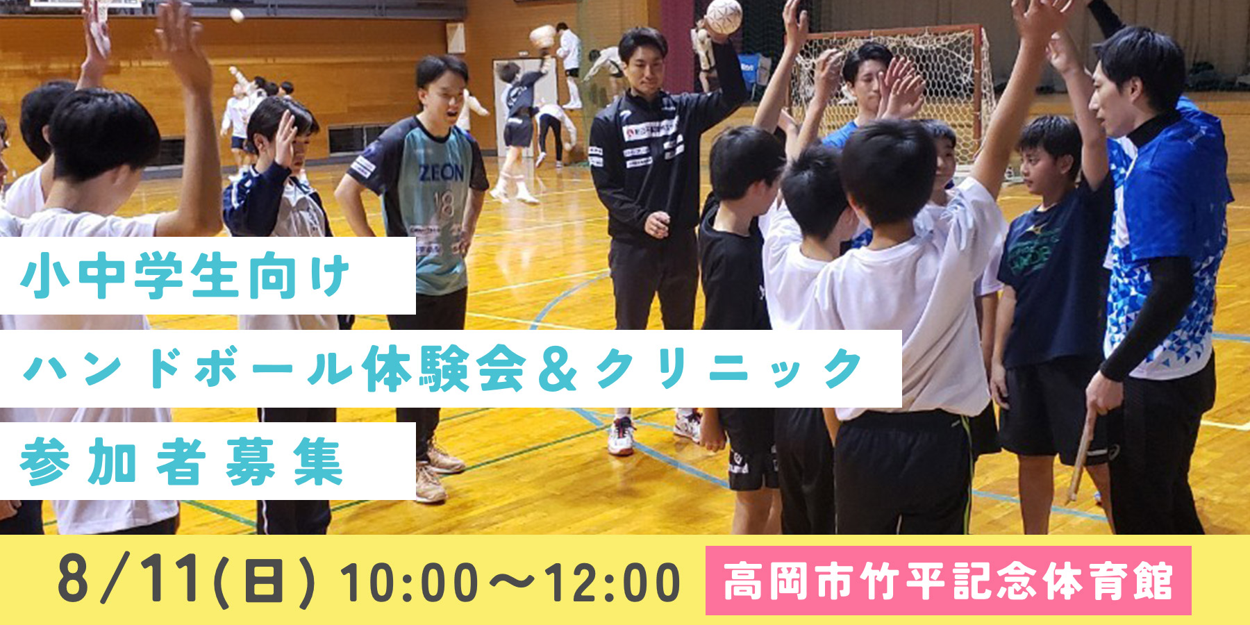 新リーグ開幕記念として、富山ドリームスでは高岡市竹平記念体育館で、小中学生を対象としたハンドボール体験会&クリニックを開催します。