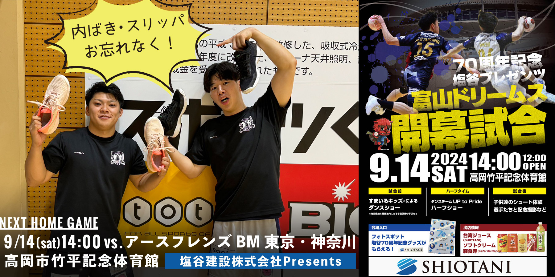 会場入り口では塩谷70周年記念グッズと、富山ドリームス応援ハリセンのWプレゼント!