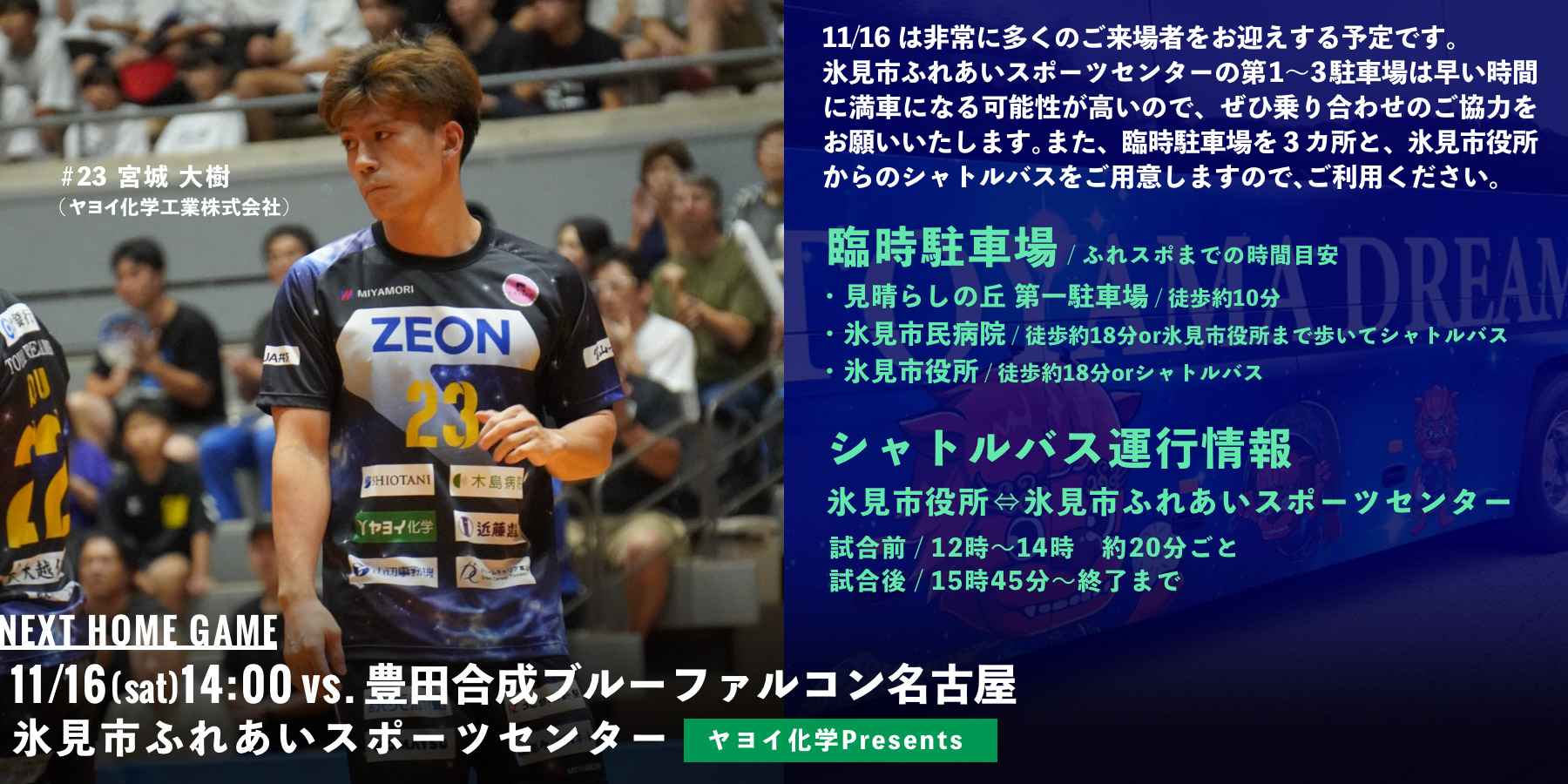 ※11/16日分はご予約を締め切りました。ぜひ次のホーム試合、11/30(土)14:00 vs.トヨタ紡織九州レッドトルネードSAGA (氷見市ふれあいスポーツセンター)をご検討ください。
