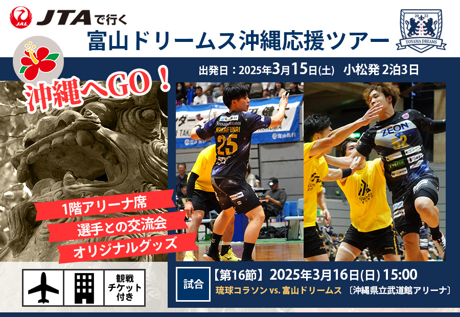 2025/3/16(日)15:00(沖縄県立武道館アリーナ)開催、琉球コラソン vs. 富山ドリームスの観戦チケット付きの「小松=那覇JTA直行便で沖縄へGO! 琉球コラソン vs. 富山ドリームス 応援ツアー」が参加者募集中です。