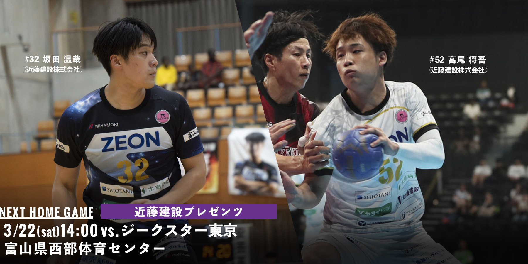 3/22(土)は、2025年2回目の砺波市でのホーム試合、そしてNo.52/高尾将吾選手・No.32/坂田温哉選手の勤務先である近藤建設株式会社様の冠試合です。